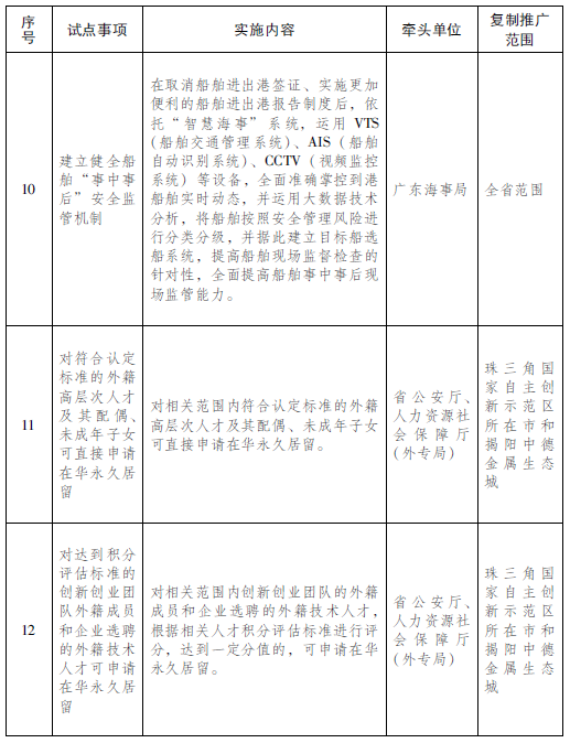2.在珠三角国家自主创新示范区所在市和揭阳中德金属生态城复制推广(6项):对符合认定标准的外籍高层次人才及其配偶、未成年子女可直接申请在华永久居留;对达到积分评估标准的创新创业团队外籍成员和企业选聘的外籍技术人才可申请在华永久居留;对外国人以自然人或本人身份作为控股股东的公司企业在相关范围内直接投资,符合条件的可申请在华永久居留;对符合条件的外籍华人可直接申请在华永久居留;对在广东省相关范围创业的外籍华人可凭工作许可和雇主担保函件申请办理相关居留许可;对经公安机关备案的企业邀请前来实习的境外高校外国学生可便捷办理签证手续。