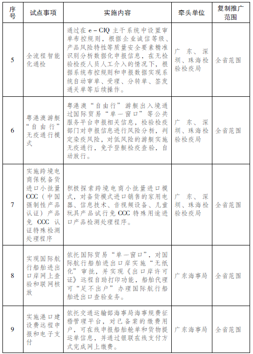2.贸易便利化领域(6项):全流程智能化通检,粤港澳游艇“自由行”无疫通行模式,实施跨境电商保税备货进口小批量CCC(中国强制性产品认证)产品免CCC认证特殊检测处理程序,实现国际航行船舶进出口岸网上查验和联网核放,实施港口建设费远程申报和电子支付,建立健全船舶“事中事后”安全监管机制。