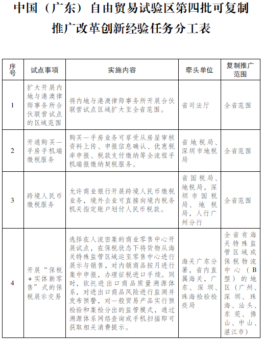 附件:中国(广东)自由贸易试验区第四批可复制推广改革创新经验任务分工表
