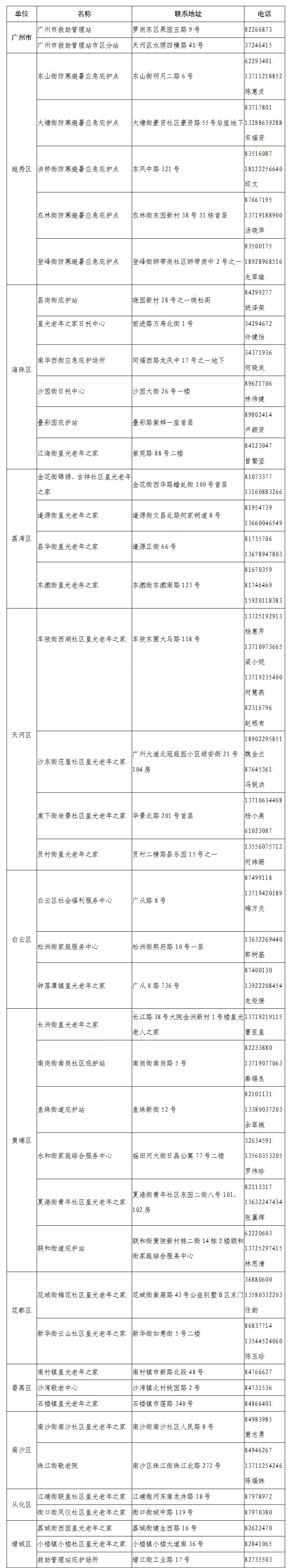 广州市各区24小时防寒避暑临时庇护场所地址和电话一览表