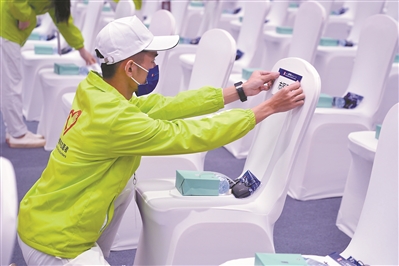 志愿者正在布置会场。