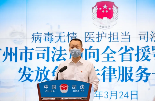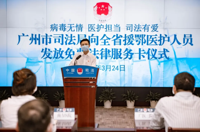 3月24日上午,广州市司法局举行了为全省援鄂医护人员发放免费法律服务卡仪式,市司法局局长廖荣辉、副局长何友汉为南方医科大学南方医院和广州医科大学第三附属医院的代表发放了免费法律服务卡。