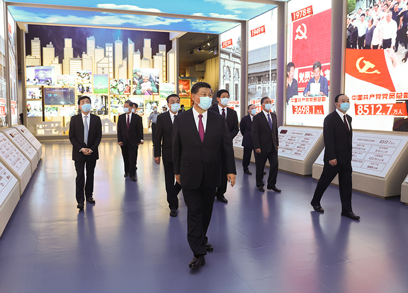 新近落成的中国共产党历史展览馆巍然矗立,气势恢宏。下午3时20分许,习近平等党和国家领导同志来到这里,步入展厅参观展览。展览以“不忘初心、牢记使命”为主题,精心设计了“建立中国共产党 夺取新民主主义革命伟大胜利”、“成立中华人民共和国 进行社会主义革命和建设”、“实行改革开放 开创和发展中国特色社会主义”、“推进中国特色社会主义进入新时代 全面建成小康社会 开启全面建设社会主义现代化国家新征程”4个部分,通过2600余幅图片、3500多件套文物实物,第一次全方位、全过程、全景式、史诗般展现中国共产党波澜壮阔的百年历程,浓墨重彩地反映党的不懈奋斗史、不怕牺牲史、理论探索史、为民造福史、自身建设史,使人们深刻认识到红色政权来之不易、新中国来之不易、中国特色社会主义来之不易,深刻认识到中国共产党为什么能、马克思主义为什么行、中国特色社会主义为什么好。