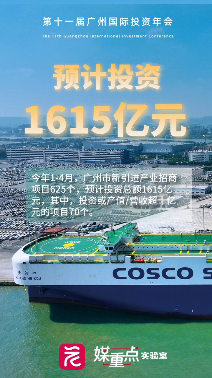 发布会还透露,今年1-4月,广州市新引进产业招商项目625个,预计投资总额1615亿元,其中,投资或产值/营收超十亿元的项目70个。
