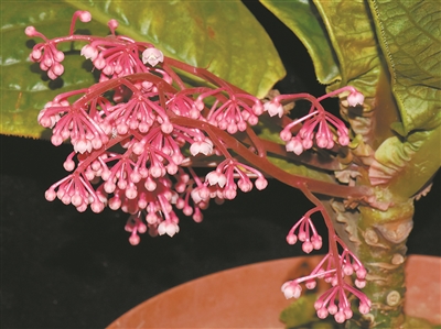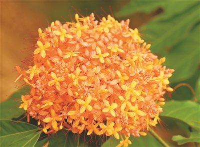 另一个获得审定的新品种“四季无忧”则来自无忧花属,和紫金牛属新品种一样同为常绿灌木,株高1~3m,树冠宽圆形,分枝低。新叶下垂呈黄绿色,伞房状圆锥花序,花色特别,处于黄色到橙红色之间。“四季无忧”花期为3~12月,较中国无忧树花期更长,一年四季花开不断。此外,其花朵繁密,具有极高的观赏价值,可用于庭院栽培或盆栽观赏,具有较好的推广应用前景。