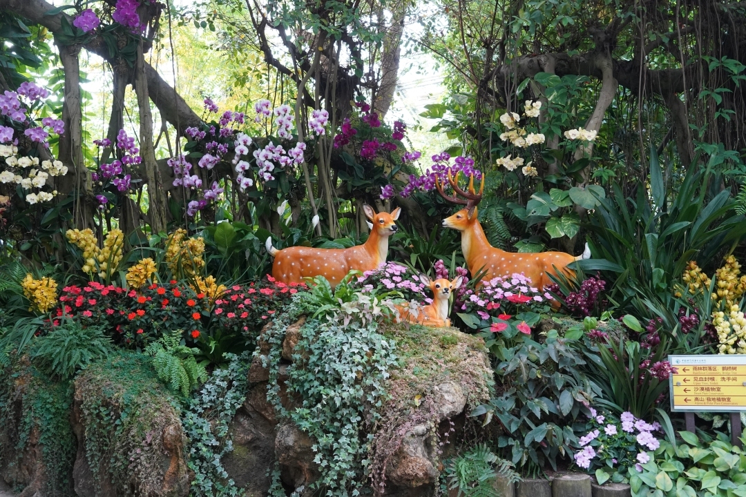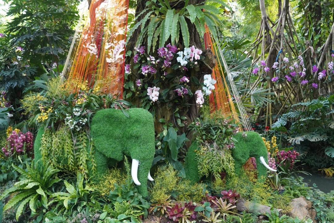 “雨林秘境:兰花与生灵”展区则以高大的乔木、郁郁葱葱的灌木和低矮的草本植物营造出层次感,潺潺的小溪、古朴的独木桥以及漂浮的小木船共同展现了一个沉浸式雨林生态环境。在这里,兰花被种植于树干上、岩石上、苔藓地以及小溪边,与周围的雨林植物和动物相映成趣。素有“雨林工程师”之称的亚洲象出没于灌木和草丛中,为本场景增添了奇趣与活力。不同种类的兰花生长于不同的微生境中,为众多生物提供栖息地与食物源,在生态系统中发挥着重要的作用。