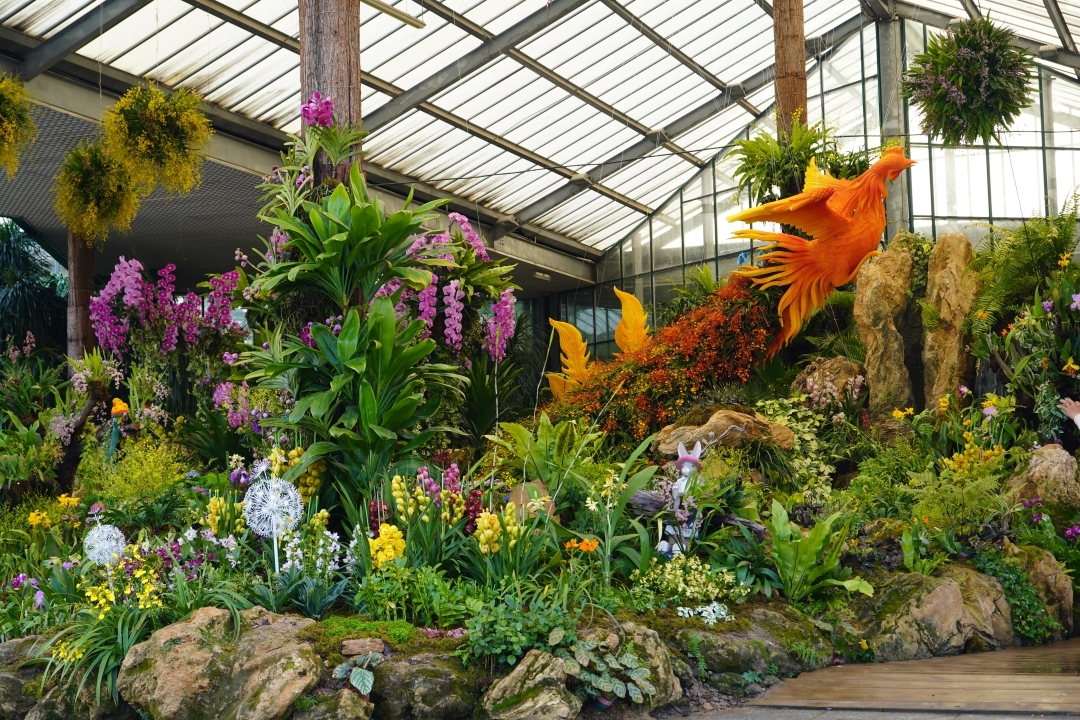 “百鸟朝凤 万物和谐”展区融合兰花、鸟类、溪流和山石等元素,旨在展现自然和谐之美。在整体布局上,大型凤凰造型形成视觉焦点,凤凰下方模拟自然生态环境,设置假山、溪流以及各种兰科植物和蕨类植物,营造自然野趣。场景左侧以不同颜色渐变的石斛兰打造开屏的孔雀造型,让整个景观充满生机与活力。此外,场景设置小径让游客穿梭其中,近距离感受植物的精妙之处。“百鸟朝凤”在中国文化中象征着吉祥、和谐与繁荣,该展区不仅展现了动植物间的和谐关系,还展现了人们对美好生活的向往和对祥瑞之气的追求。