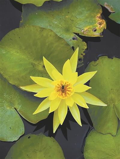 水生植物园内一众植物以澳洲巨睡莲为首,凭借“世界之最”的响亮招牌吸引游客。据介绍,澳洲巨睡莲原产于澳大利亚、新几内亚等地,于近期引入我国,是世界上已知的株型和花最大的睡莲。蹲下端详发现,澳洲巨睡莲可谓是睡莲界的“天花板”,之所以“霸气四射”,因为它既有荷花丰满的身型,又有睡莲妖娆的色泽,二者合一便为“水上尤物”,无时无刻不受蜂蝶青睐。