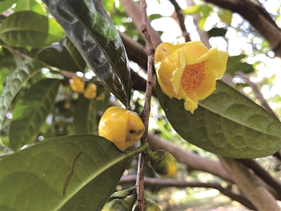 若“以颜色论英雄”,山茶园里最引人注目的品种,非“植物界的大熊猫”——金花茶莫属。据华南国家植物园方面介绍,早在明代李时珍的《本草纲目》 中就记载有黄色茶花,然而一直到1933年,才在广西首次采到了其果实和枝叶,1948年正式发表,由植物学家威经文命名为“亮叶山茶”。1960年首次发现了其花,1965年将其定名为“金花茶”。由于分布少,且是我国特有品种,因此被列为国家一级重点保护植物,誉为“植物界的大熊猫”。此外,金花茶也是具黄色花朵的山茶类群的总称,已知的有20多种。