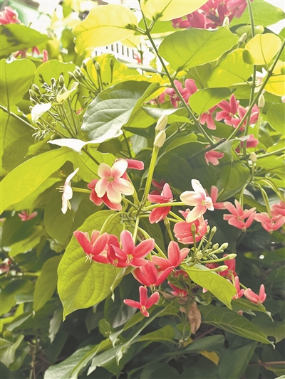 在五月的广州街头,记者留意到使君子迎来了新一年的首次开花。异色同株,盛开时铺满树冠,花多叶茂自成风景。忽白忽红忽紫,犹如百变万花筒。使君子的花期较长,一树芳华能持续整个夏天之久。