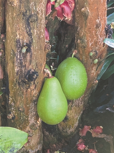漫步植物园,总会在不经意间发现惊喜——黄金木瓜的果实刚刚长出,虽然还不能体现出成熟后的金黄颜色,但是它温润的表皮也足够赏心悦目;莲雾挂满枝头,散发出阵阵清香;千指蕉层层叠叠,组合形成了霸气的姿态,若仔细观看,或许能看见花朵溢出的透明蜜汁;巧克力光亮菠萝安安稳稳“坐在”巧克力色泽的叶片中,呈现别样的意趣。