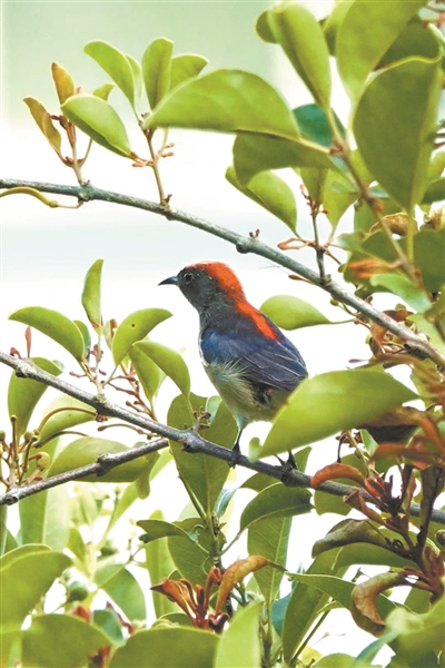 据介绍,朱背啄花鸟习惯在树冠上活动,一般生活于低山高大乔木林间,在开阔的山丘平坝地区的稀疏乔木上亦可见。它们喜欢频频光顾次生林、林园及人工林中的寄生植物,高可至海拔1000米,以寄生的果实作为主要食物。