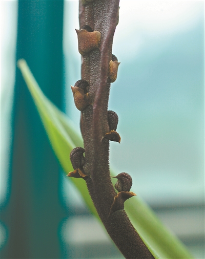 近日,记者从华南国家植物园获悉,园内奇异植物室内的大眼镜蛇石豆兰开始进入盛花期。小小的花苞形似钩状,花朵不完全开放,也没什么特殊味道,全部凋谢后,花梗仍能持续达2个月才枯萎。