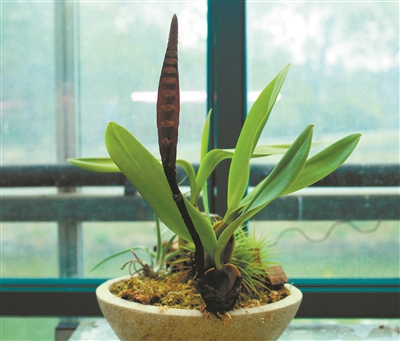 据介绍,大眼镜蛇石豆兰属于兰科家族中的石豆兰属,原产于非洲,通常附生在树干上。假鳞茎的顶端生长两枚单叶,长10余厘米,叶顶端尖而翠绿。它的花葶从假鳞茎基部长出,在顶端生成花梗,花梗长可达80厘米。花梗的视觉效果极为抢眼,长片状的形状看上去很像眼镜蛇,也因此被叫做大眼镜蛇石豆兰。