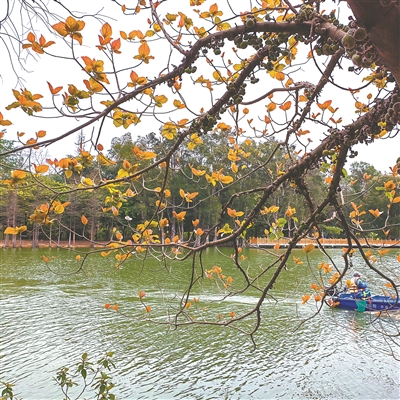 相比之下,大果榕新长出的嫩叶叶绿素少,花青素多,往往呈红色。生物园的大果榕郁郁葱葱,一如既往;水生园的大果榕则刚换上“新装”,叶子棕红,榕果簇生于树干基部和老茎短枝上,水生园的大果榕肉眼可见地对湖的“偏爱”。