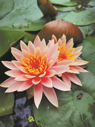 徜徉水生植物园内,只见一朵朵睡莲花傲立清澈水面,热情洋溢,芳香扑鼻。记者了解到,科罗拉多睡莲是美国园艺学家于1994年培育的优秀的睡莲品种,花橘粉,花大且多,为国内种植最多的睡莲品种之一。