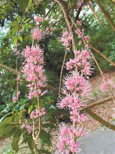 春夏之交,华南国家植物园里的奇花异草风情万种,令人目不暇接。近日,来自澳大利亚的红茱萸在澳洲植物专类园内迎来盛花期,茎干和枝条上缀满粉红色的精致小花,不但花型奇特且飘着淡淡的甜香味,充满异域风情。