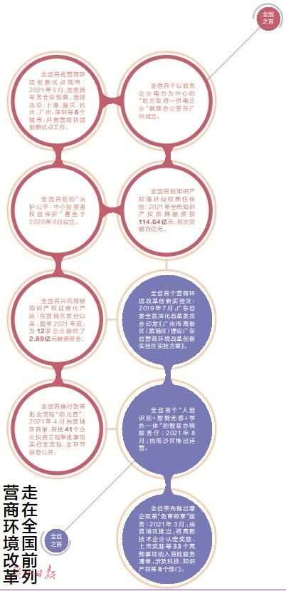 同年,广州在黄埔区、广州开发区建设全省首个营商环境改革创新实验区,率先在政务服务、创新创业、要素供给等方面先行先试,为全省营商环境改革探索经验。2021年,黄埔区、广州开发区荣膺“中国高质量发展改革创新十佳园区”第一,连续三年营商环境便利度位居国家级经济开发区第一。