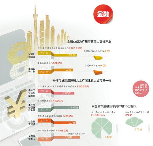 目前广州金融业总资产超过10万亿元;自2019年以来金融业已成为广州市第四大支柱产业;2021年金融业税收收入520亿元,占总税收比重为9.0%……一组组翔实的数据,彰显着广州金融发展的硬实力。