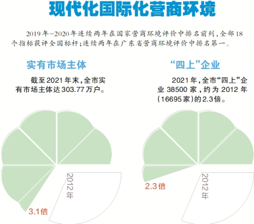 广州率先开展商事制度改革,大力推动大众创业、万众创新,营商环境持续向好。截至2021年末,全市实有市场主体突破300万户,达303.77万户,是2012年末的3.1倍。全市“四上”企业从2012年的16695家增加至2021年的38500家,相当于一个中等省份的数量,这十年净增“四上”企业21805家。世界500强集聚能力提升。截至2021年底,在穗投资世界500强企业达330家,比2012年增加近百家。广州本土两家企业——“广州建筑”“广药集团”分别以266.81亿美元、260.70亿美元的营业收入成功进入世界500强,成为粤港澳大湾区首个入围榜单的建筑企业和首个以中医药为主业入围榜单的医药企业。