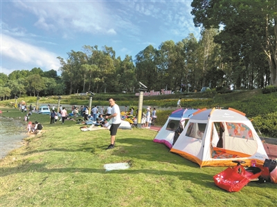 约30公里的骑行之旅,最终在二沙岛结束了。二沙岛是关鸣最喜欢的骑行地之一,而对于许多广州市民而言,这也是他们较喜欢的滨江休闲区。在二沙岛的发展公园和艺术公园草坪空地,市民搭起天幕与帐篷,看着波光粼粼的美丽江景,任由携带水汽的江风轻拂脸颊,在悦耳的鸟鸣中亲近自然。