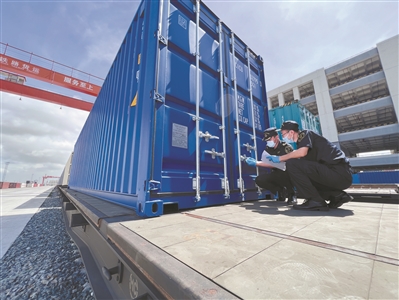 广州海关所属南沙海关关员对中欧班列集装箱进行监管