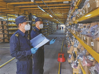 海关关员在南沙自贸试验区内的跨境电商出口退货中心仓进行监管