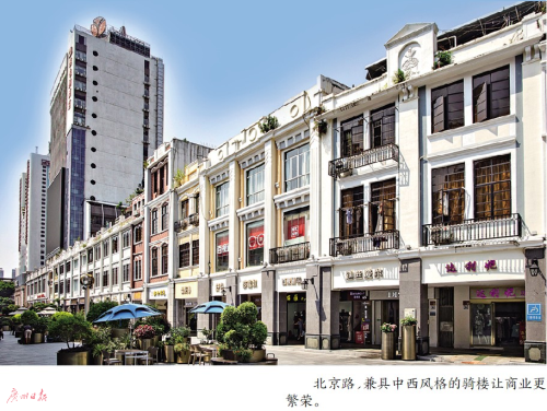 在当年城市改造中,马路由政府开辟,骑楼则大部分是由私人修建的。一幢一幢骑楼盖起来后,慢慢才连成一片。以北京路为主,涵盖了附近的中山四路、中山五路、德政路、文明路、泰康路、万福路、东华路等的骑楼群,堪称当时广州最大片的骑楼群,也是繁荣的商业中心。