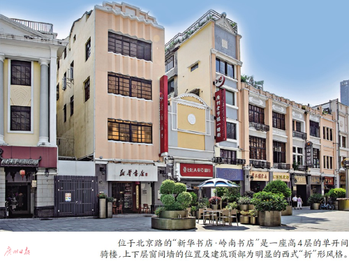 私人建造,各展所长,有仿哥特式的,有南洋式的,有西式的,也有中西融合的,骑楼可谓百花齐放。北京路步行街最北端一栋挂着“新华书店·岭南书店”招牌的骑楼就非常别致。其设计者关以舟毕业于加利福尼亚大学。这座高4层的单开间骑楼建成于1931年,两个立面风格迥异,面向今北京路一侧的正立面,上下层窗间墙的位置及建筑顶部是明显的西式“折”形风格;北立面则是典型的中式设计,如带圆拱、洗石米面层的基座,带阳台的墙身及中式的大屋顶。中外两种迥然不同的设计风格碰撞出了这幢别致的骑楼。