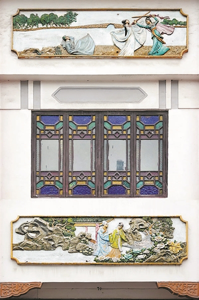 广州第十甫路骑楼街,陶陶居酒家的墙面上除了满洲窗,还有中国传统故事的彩色浮雕