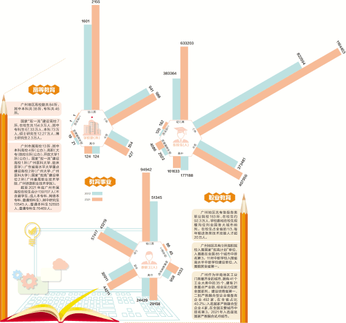 职业教育综合水平全国领先,9所高职院校入围国家“双高计划”单位,入围数在全国85个城市中排名第3;11所中职学校入围省高水平中职学校建设单位,入围数居全省第一。高等教育规模不断扩大、人才培养质量持续提高、学科专业特色更加凸显、科学研究水平不断提高;广州医科大学纳入国家第二轮“双一流”建设高校行列。实现困难学生资助全覆盖,特殊教育保障水平大幅提升,全市建成资源教室268间,逐一做好适龄残疾儿童少年的义务教育入学安置工作……