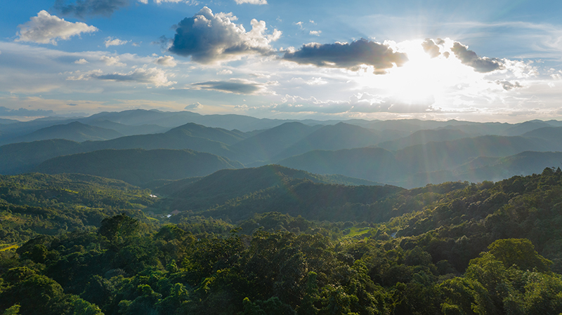 这是2023年9月16日拍摄的日落时分的云南普洱景迈山风光(无人机照片)。