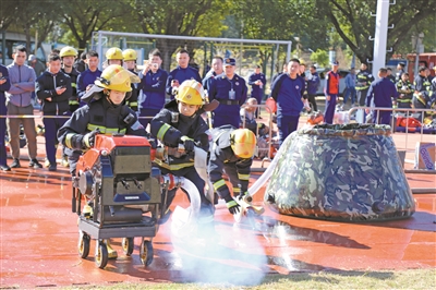 参赛选手比拼“快速破门救人操”项目。