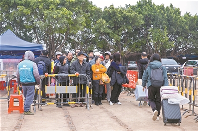 村民在临时码头有序排队等候搭乘轮渡进岛。
