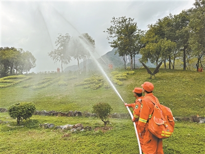 2021年,增城区派潭镇被定为全国6个“基层森林防灭火规范化管理”试点乡镇之一。派潭镇相关负责人介绍,派潭镇完成4大类16项60个试点工作任务,探索出“分网格、明责任,盯重点、守路口,涉用火、云审批,有火情、通村居,打清守、三不离”工作方法,创新五项举措打造森林防灭火规范化管理小镇,试点以来实现了“零火灾”的工作目标。图为派潭镇应急救援队开展“以水灭火”演练。