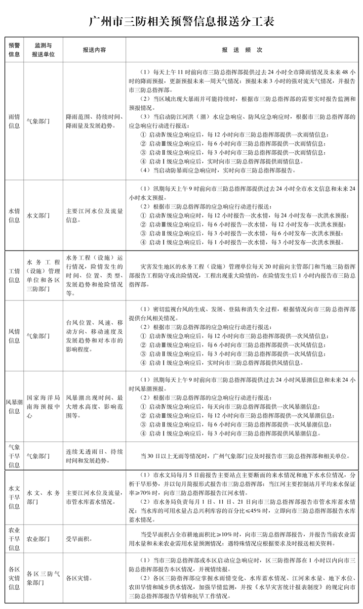 (30)广州海事局:负责向辖区水域船舶播发气象灾害预报预警信息;组织、指导水上交通管制工作,维护水上交通秩序;协助转移受灾群众;组织开展水上交通事故应急处置和应急救援工作;核查本系统因灾损失情况,报告市三防总指挥部。