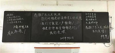 “我们走啰,感谢广东人民、政府!”“你们对福建的渔船员工的关爱,我们只能说一声谢谢!”……在南沙区横沥镇的横沥小学临时安置点内,一间教室的黑板上写满了来自福建渔民们的感谢留言。