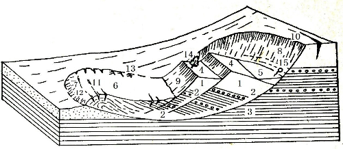 1-滑坡体;2-滑动面;3-滑坡床;4-滑坡台地;5-滑坡洼地;6-滑坡鼓丘;7-滑坡舌;8-滑坡后壁;9-滑坡台地陡坎;10-拉张裂缝;11-鼓张裂缝;12-扇形张裂缝;13-剪切裂缝;14-醉汉树或马刀树;15-滑坡泉