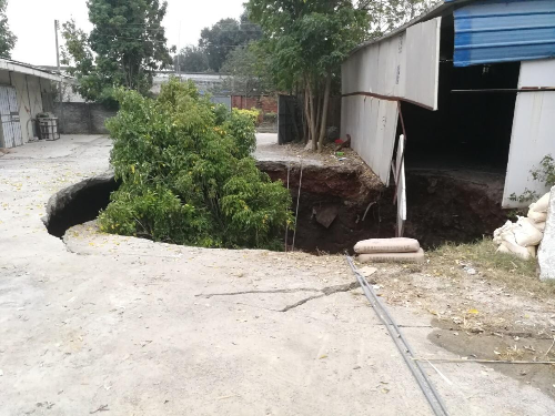 2.地面变形。如地面出现环状裂缝并不断扩展,产生局部地鼓或下沉现象。它们一般是土洞扩展到一定规模后其顶板已接近极限平衡状态的现象,这时地面已处于临近塌陷的危险状态。
