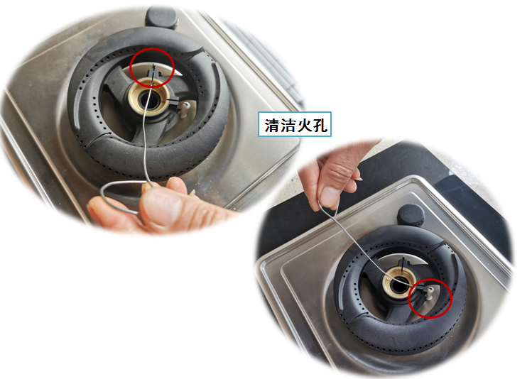 第一,检查燃气灶的中心火盖和外环火盖有没有水滴或油污,如有可用纸巾、干燥毛巾清洁或用铁丝通火孔。