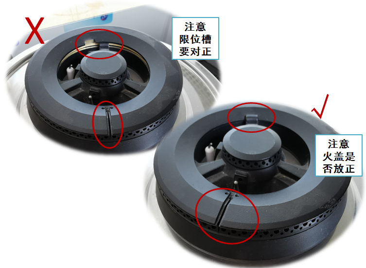 第三,检查清洁完的火盖、盛水盘有没有放正、放歪,注意限位槽要对正。