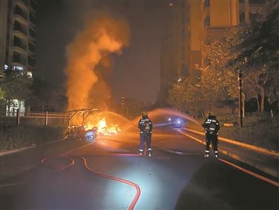 6月3日凌晨1时26分,汕头市一小区停车场突发火情。接到报警后,消防救援力量立即赶赴现场扑救,并疏散楼上多名住户。2时09分,明火基本扑灭。