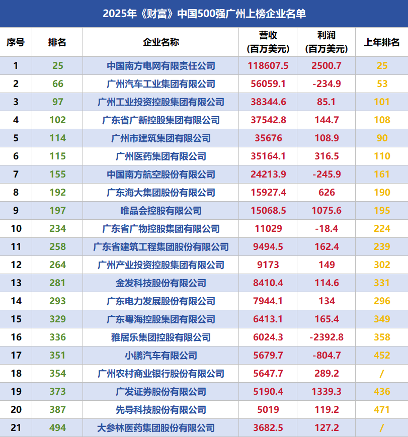 近日,2025年《财富》中国500强排行榜新鲜出炉,广州共有21家企业上榜,其中19家连续上榜企业,2家新进企业。