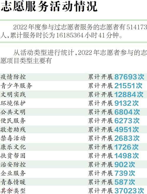 实施“我为群众办实事”青年志愿服务专项行动,2022年共计开展活动6.51万场,志愿者累计上岗100.33万人次。