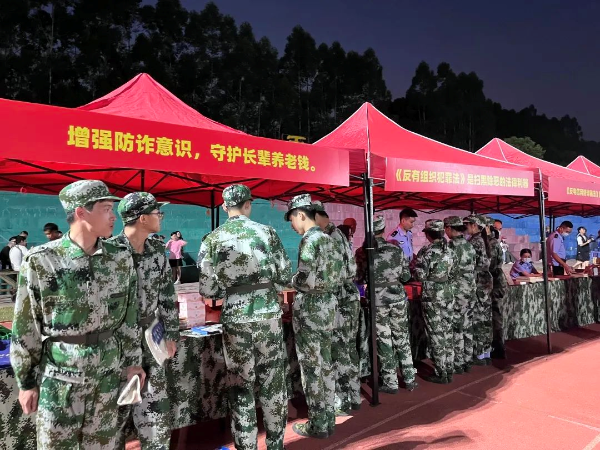 舞台的另一边设置反诈、扫黑除恶等宣传摊位,并通过现场普法、悬挂宣传标语、发放宣传小册子和精美礼品等方式进行反诈骗、反邪教、反恐怖主义、市域社会治理、法制教育等宣传,吸引了众多师生参加。