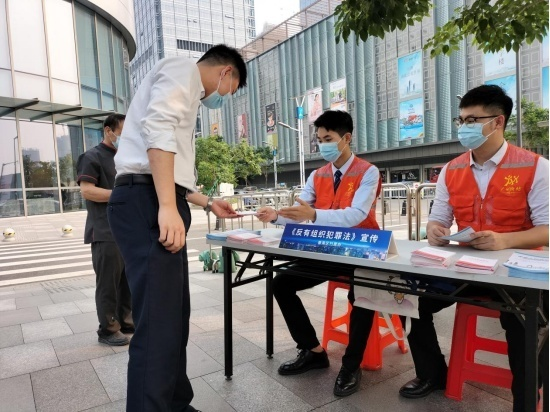 “您好,我们今天来进行《反有组织犯罪法》的宣传,这是我们印制的宣传彩页,里面有详细内容、法律亮点解读等内容,您可以了解一下。”“我最近经常在网上能看到这个《反有组织犯罪法》,正想着详细了解一下,你们今天的宣传太及时了”。