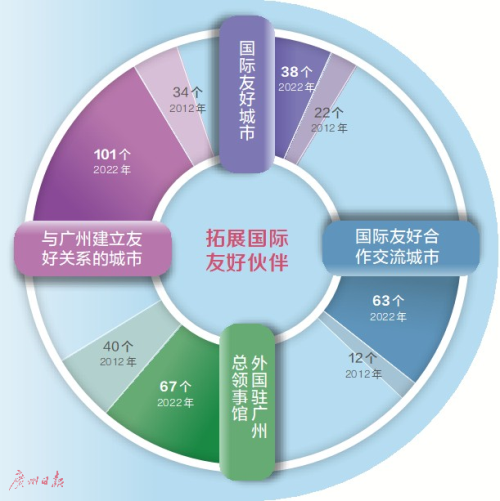 友城已成为广州对外交流的重要渠道,也是广州城市国际化的重要标志。2012年以来,广州新增67个结好城市,新增27家外国驻穗领馆。2021年底,广州如期完成国际友城“百城计划”,目前已与遍布全球六大洲66个国家的101个城市建立友好关系,外国驻穗领馆达67家,全面形成“四位一体”的友城交往格局,打造出富有活力的全球城市朋友圈。