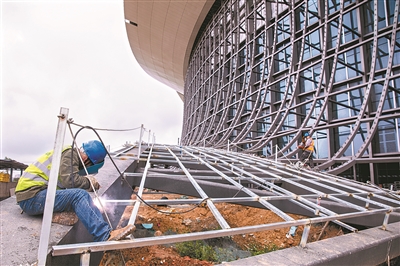 记者在现场看到IFF永久会址国际会议中心金属屋面的装饰铝板已铺设完成,“木棉花”已然盛开。弯曲起伏的屋面,让整个建筑造型优雅灵动,空中俯瞰恰似迎风绽放的木棉花,又似一群海边展翅欲飞的鸿鹄。