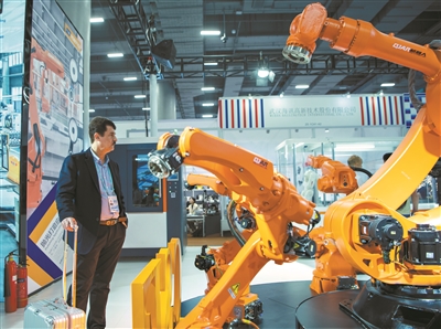 工业自动化及智能制造展厅展出的工业机器人吸引了客商的注意。
