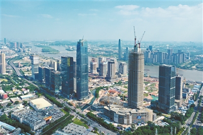 广州国际金融城已集聚了金融监管机构、广发银行等国内外金融机构。同时,广州国际控股集团在内的总部企业等数十家金融巨头已确认进驻,金融服务体系已日趋完善。图为建设中的广州国际金融城。